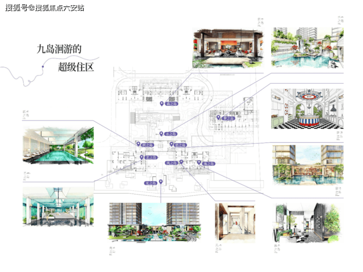 🟣多维立体 城市浮岛悬浮于城市上空的生活美学岛屿,悬浮绿洲、门厅飞瀑开场,入境“一轴七岛十一境”的超级立体庭园。七大主题岛屿,连岛成洲,构建浮岛庭园洄游动线。园中下沉庭院、戏水池、镜面水院等等让园景层次丰富、无限变幻,呈现岛的风景“发现”之旅。