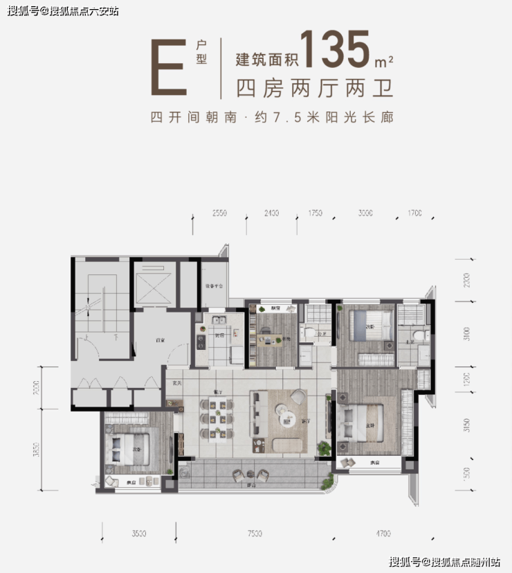建面约135㎡的四房户型加入了当下很流行的横厅设计,餐客厅7.5米的大面宽,还配有南向的阳光长廊,同时得益于横厅设计,室内几乎没有无用的走廊空间,空间利用率很高。