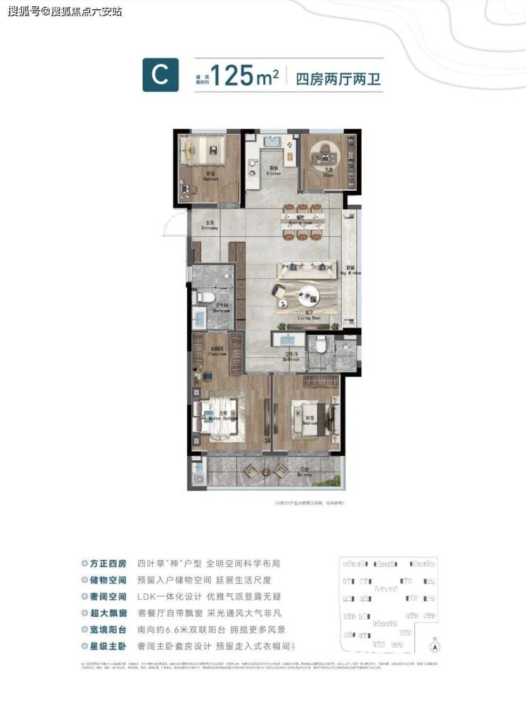 • **125㎡四叶草四房**:约9.9㎡双联观景阳台,LDK一体化横厅衔接约5.35米飘窗,主卧16.3㎡奢阔空间,匹配改善家庭全生命周期需求;