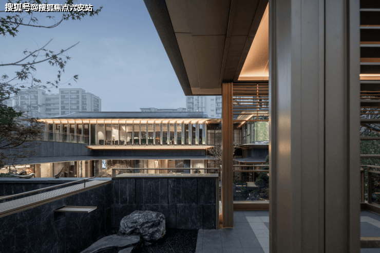 项目以《千里江山图》为灵感,将宋代园林的“深远”意境融入现代建筑,入口处黑金砂石铺就的“山岚”意境伴随流瀑蜿蜒,宛如宋画中的山水长卷徐徐展开,园中两株珍稀罗汉松冠盖如云。