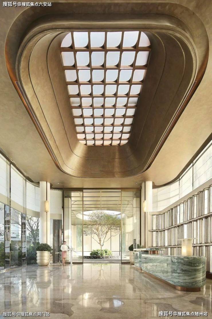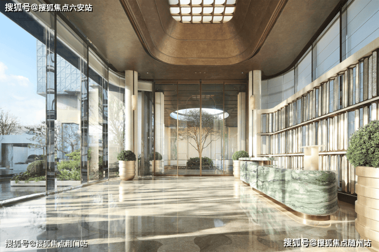 主入口大门高度达到了约7米,置身其中,尊贵气派。选用贝金米黄石材、维多利亚绿与白雪公主奢石,搭配古铜色金属板,巧妙融合冷暖色调,营造出极具张力的美学效果。