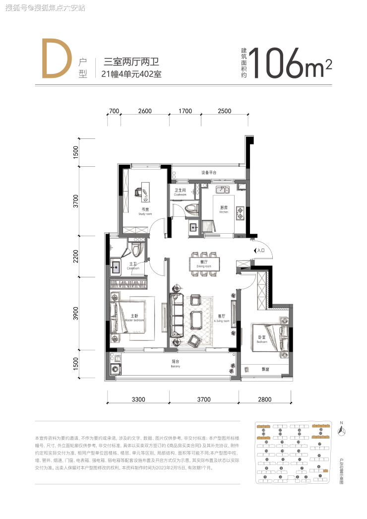 • 106㎡三房:经典飞机户型,南向双阳台,得房率85%,总价约208万起;