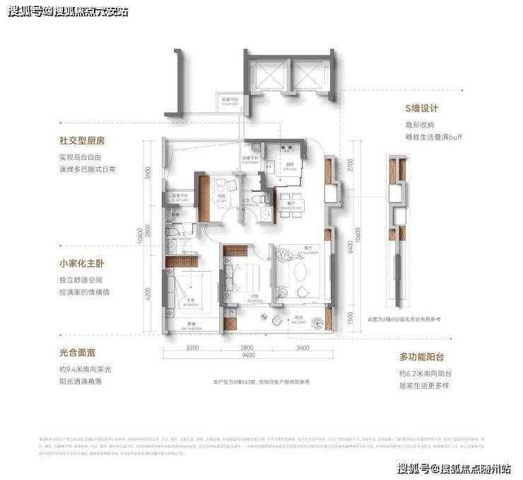 三房朝南,面宽约9.3米,户型设计双阳台双飘窗,能完美地将生活与休闲功能分隔开;主卧套房设计,尺度宽绰,带步入式衣帽间,处处彰显改善盘的空间感。