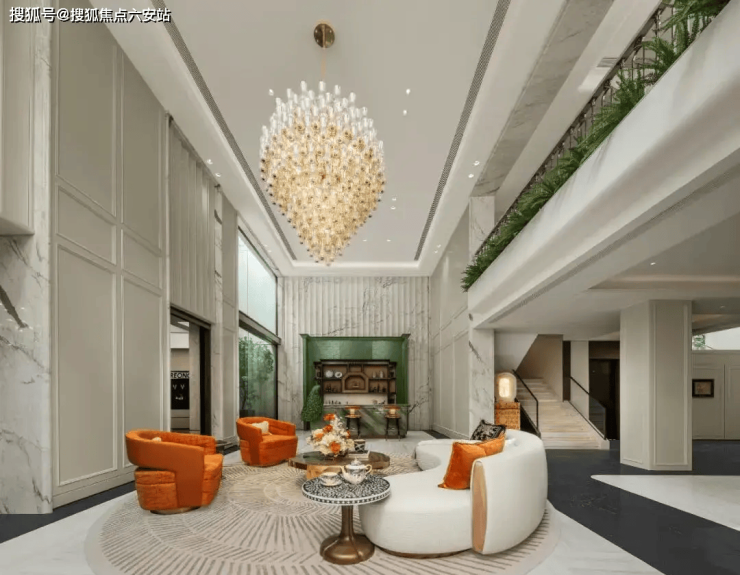 比如首开的1号楼,架空层就像一座陈列着书籍的美学空间,雪山兰等奢石铺陈,搭配主题logo拼花石材、叠级吊顶等设计,尽显高阶的温润感。