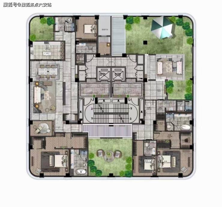 建筑规划层面,项目采用顶层观景平台与下沉庭院相结合的立体景观体系,200平方米空中观景平台实现全景山水视野,25米超尺度建筑面宽配合270度环幕视窗设计,突破传统空间界面限制。入口空间通过序列化景观轴线营造尊崇礼序,核心区规划万方中央景观园林,以《富春山居图》为设计蓝本构建移步易景的立体艺术空间。