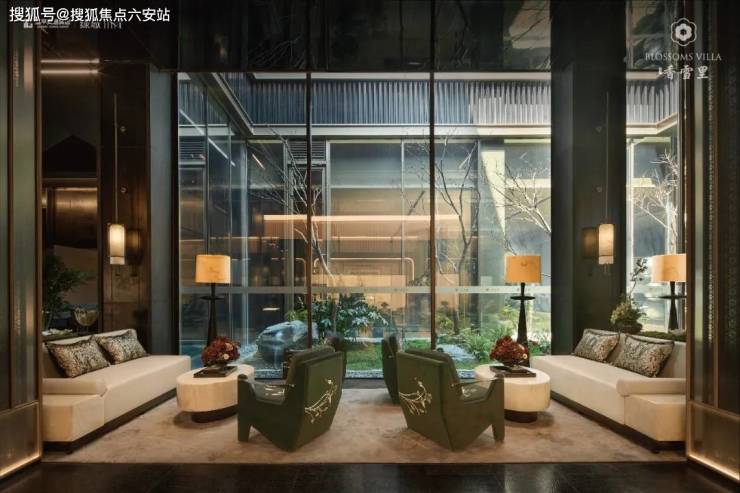 整个大门宽约50米,项目并不盲目追求“大”尺度,而是主打低调「隐奢」,更符合江南大户人居的特质。配色和用材都很奢雅,你看大面积景墙是由亚马逊绿奢石打造的,中间金石镶嵌着项目Logo,刻着香雪里的名字,还有超山独有的六瓣梅的图腾,在视觉上就非常惊艳。