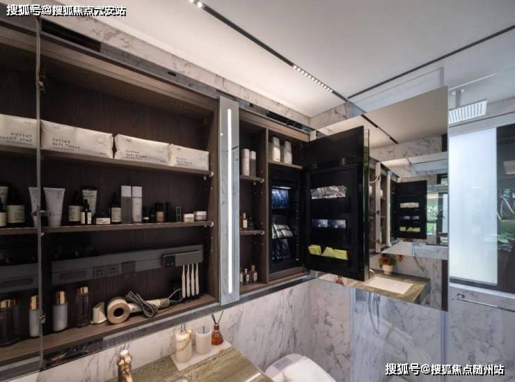 例如,大师高定的隐藏移门,采用横向金属格栅背衬瓦楞夹丝玻璃的做法,暗藏三重工艺“格栅层镶嵌装饰、瓦楞层隐私保护、夹丝层银光微闪”,烹饪时关闭,日常也可以隐藏,让客厅更宽敞。