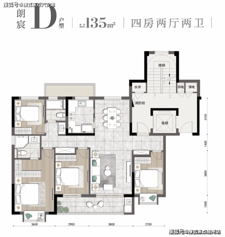 这款建面约135㎡的户型四开间朝南,南向开间将近约13米,朝南三个卧室,带飘窗或者阳台,全屋通透明亮。