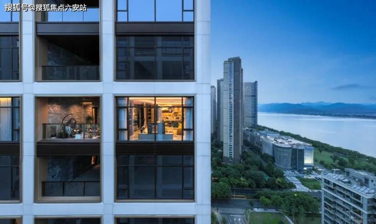 建筑以“金镶玉”为灵感,白色铝板镶嵌香槟金窗框,搭配LOW-E双层中空玻璃幕墙,形成油画框般的立面美学。每户标配约40㎡U型空中花园,可定制私人泳池、森系庭院或星空酒廊,270°全景落地窗将钱江潮涌、西湖群山与城市灯火尽收眼底。