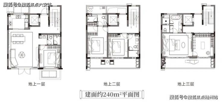 建面约240㎡的中间套:同样是大四房格局,二三楼都有宽约8.9米的跑道式阳台,四季美景循环播放。