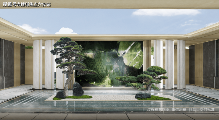 穿过归家大堂,颇具前卫感的水岸会客厅映入眼帘。廊架下的两块艺术玻璃,采用“宝格丽”同款翠色门面造型,直线与格纹结合,呈现玉石的高级质感。前景池底铺装同色系砖石,仿佛镶嵌了一面钻石水镜,伴随跌水泛起珠光涟漪。