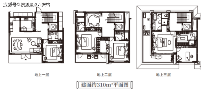 以315㎡边套为例:四房三厅三卫,二层两个超30㎡大套房,各带独立卫浴和衣帽间;三层整层主卧套房,超40㎡,外接L型大露台。