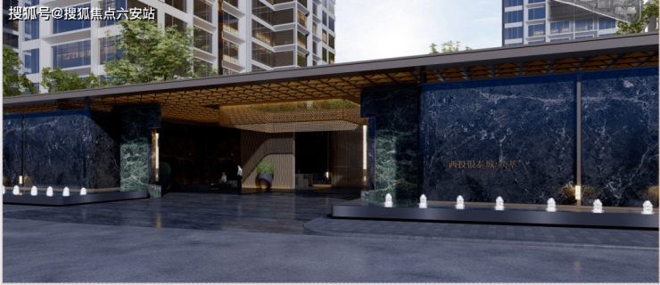 建筑立面现代挺拔,采用全铝板贴面,符合高端办公和公寓的配置,在此基础上,改造内容包括:大堂出入口、增加楼栋首层泛会所、增加公共会所泳池、优化园区标志性主入口。主入口采用干挂芬迪黑石材、普拉达绿石材、古铜色铝板等进口材料,整体现代且华贵,灯光点缀,调性高雅,近人尺度细节丰富,打造豪华入口,提升尊贵体验感。
