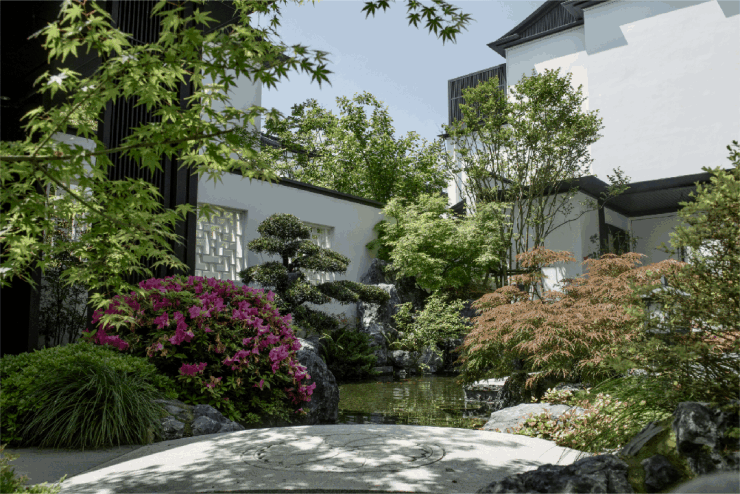 项目为低密宋风院墅,在整体的布局与景观设计上,完美还原了中式建筑的隐逸与审美意境。从各地甄选来的大乔木、黑松、乌桕、夏鹃等名贵植被,以及几乎一年四季都有开放的各类花卉,在静谧悠长的曲径里,共同抒写着中国古典院落的人居情怀。