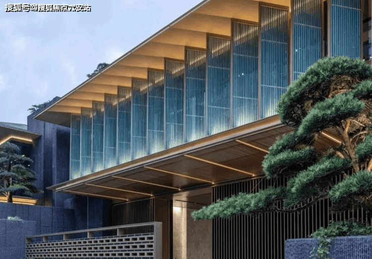 与望月松、伴月桥、月影亭构成“青岚三月”三重景致,移步换景间尽显“曲径通幽”的雅趣,建筑立面提取歇山顶形制,以深挑檐与金色铝线条勾勒出棱角分明的轮廓,大尺度灰蓝玻璃幕墙如画框般将山水纳入室内,实现“建筑隐于自然”的意境。