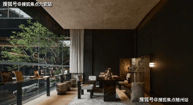 配色和用材都很奢雅,你看大面积景墙是由亚马逊绿奢石打造的,中间金石镶嵌着项目Logo,刻着香雪里的名字,还有超山独有的六瓣梅的图腾,在视觉上就非常惊艳。