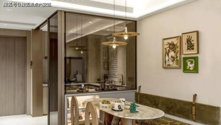 建面约95㎡的三开间朝南户型,从进门处就有巧思,特殊设计的“S墙”,正好可以将冰箱内嵌,为厨房省去一大块空间,墙面还能照样拉平,美观且实用。原本厨房的冰箱位,用玻璃墙作为隔断,既保持厨房台面的完整,形成U字动线,也可保持视线与光线的通透,一抬眼就看得到客厅。