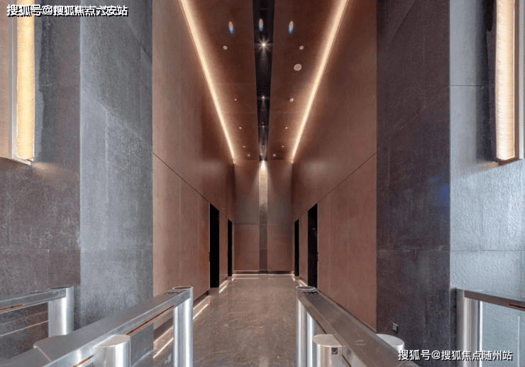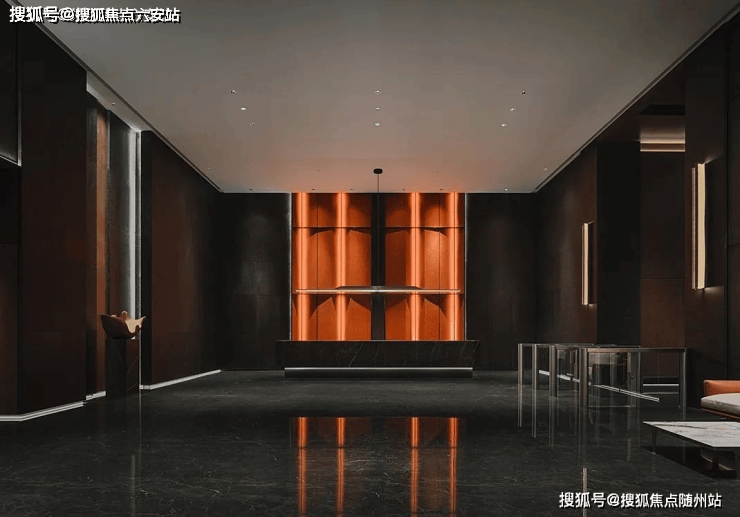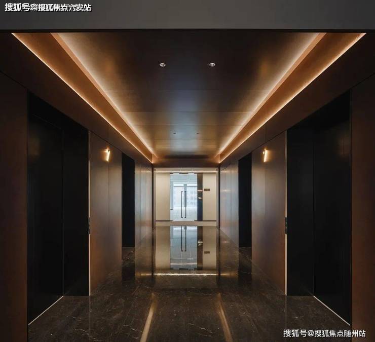 通往高层的电梯入口安排在接待台的右手边,符合行走的第一顺位。挑空的恢弘气质将空间的大气之势拉开帷幕,黑与橙的主色调相融营造了严谨的企业文化气质。近六米高的悬挑空间延伸至电梯厅,内与外空间的规整性与延展性达到了高度的契合。