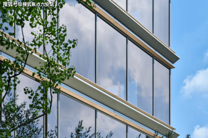 外立面选用宝格丽酒店同款保加利亚进口维纳多奢石,配以奥体望潮同款大面积纯平超白玻,打造出极高的窗墙比。暖白色干挂石材与铝板相结合,创造出一种现代潮奢、通透灵动的光影立面效果。