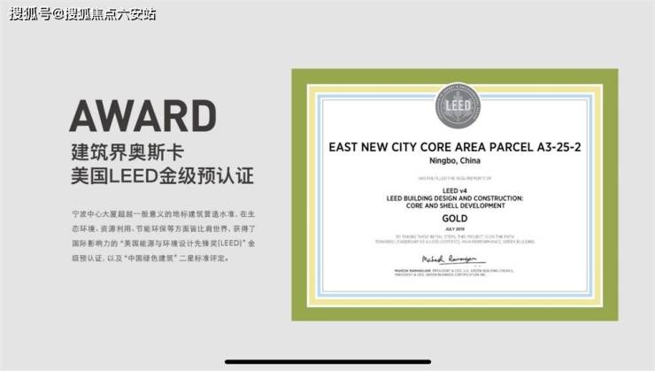 建筑界奥斯卡美国LEED金级预认证,宁波中心大厦超越一般意义的地标建筑营造水准,在生态环境、资源利用、节能环保等方面皆比肩世界,获得了国际影响力的“美国能源与环境设计先锋奖(LEED)”金级预认证,以及“中国绿色建筑”二星标准评定。