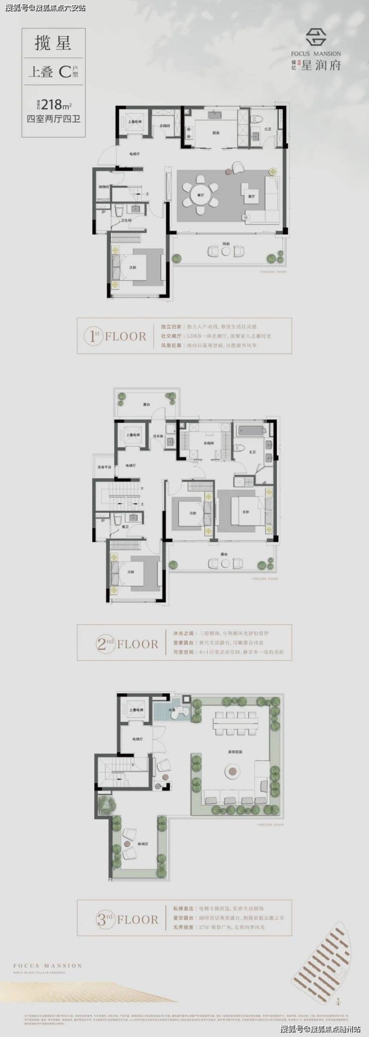 独门独院,独立私梯直达:独门独院专梯入户,下叠享南向独立花园,中叠/上叠拥享超尺观景露台,梦圆有天有地有院落的独墅人生。