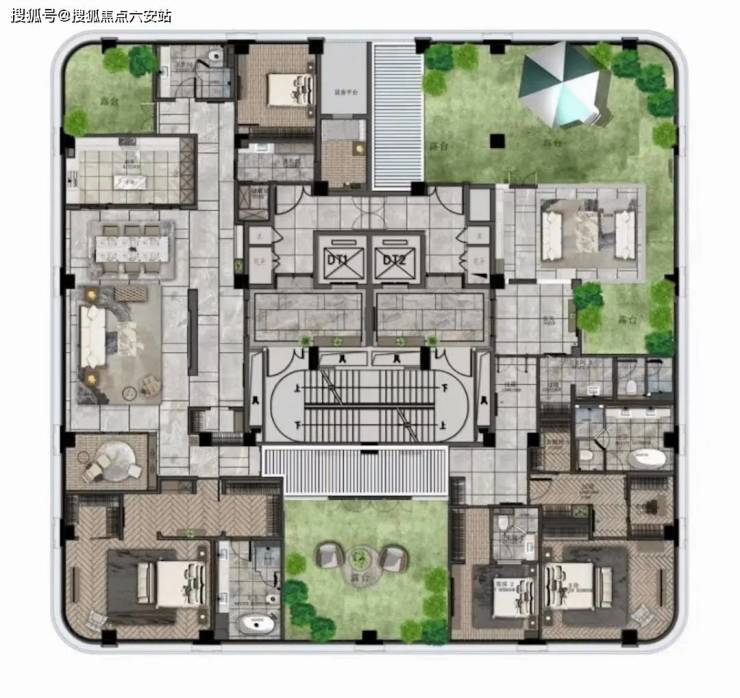 顶楼490㎡户型“一层一户”,赠送3个露台,媲美别墅空间体验。