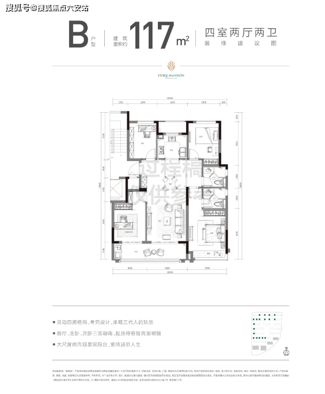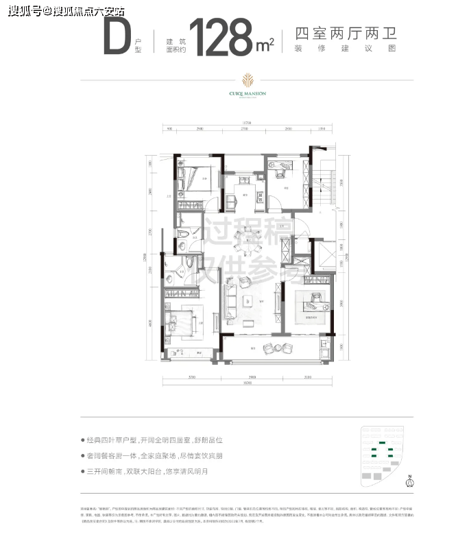 • 128㎡四叶草格局:南北通透大方厅,U型厨房+岛台,满足三代同堂需求;